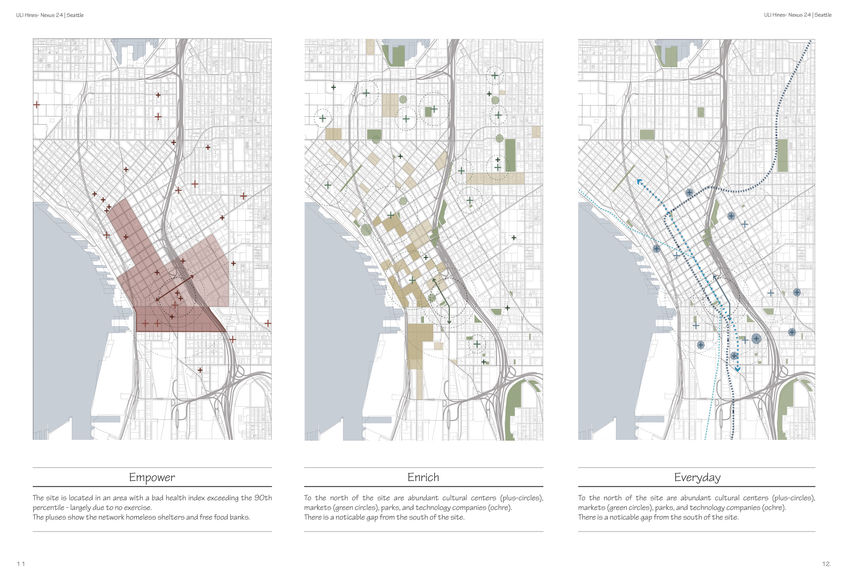 At an intersection of Seattle’s history and global diversity is the Nexus24. It is a new vision for the development of Seattle, developed for the people. Set on the highest standards of sustainability, the mixed-use, mixed-income neighborhood is designed on the guidelines of LEED and WELL. It connects and transforms, facilitating a thriving community. Nexus24, a 24-hour neighborhood, is an ecosystem of residential, retail, health, art, and innovation developed as an amalgamation of holistic new development and historically preserved and repurposed architecture. The new development responds to the deficit in the community and attempts to enable a more prosperous civic life. It is designed to be a transformative beacon in downtown Seattle. The project is stitched together with streets as spines of social justice, community engagement, and everyday life, based on the history of the finer grain of the site and the intersection of dramatically distinct neighborhoods. The street network is punctuated with nodes of art, culture, local businesses, markets, everyday activities, and public infrastructure. Corresponding programs emerge from the street spines, creating a holistic neighborhood for converging diverse people and lifestyles.